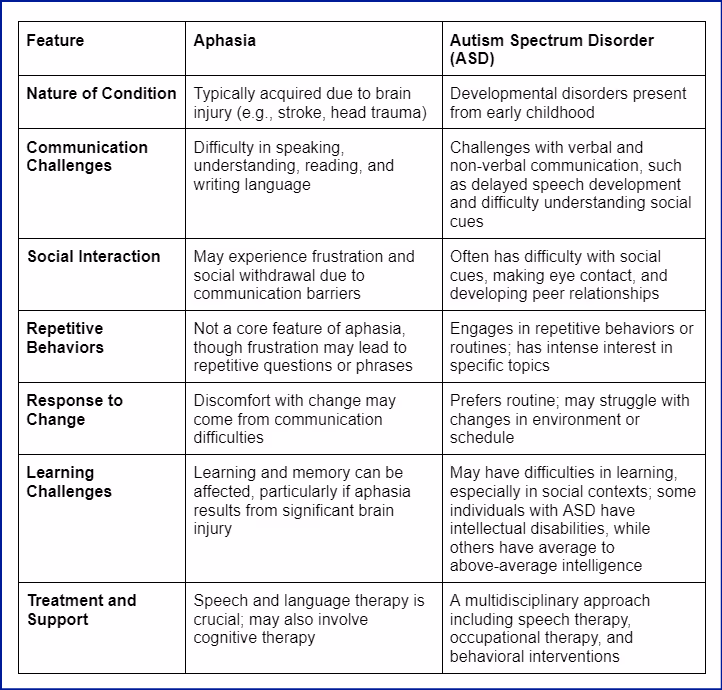 with autism, therapy focuses on improving social communication skills, while for aphasia, the emphasis is on recovering language abilities. A tailored approach, considering the unique needs of the individual facing both conditions, can enhance communication skills and overall quality of life.