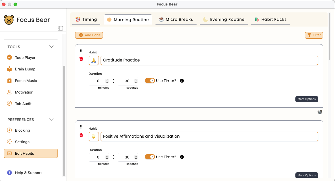 In the morning, Focus Bear will guide you through each of your habits one at a time.